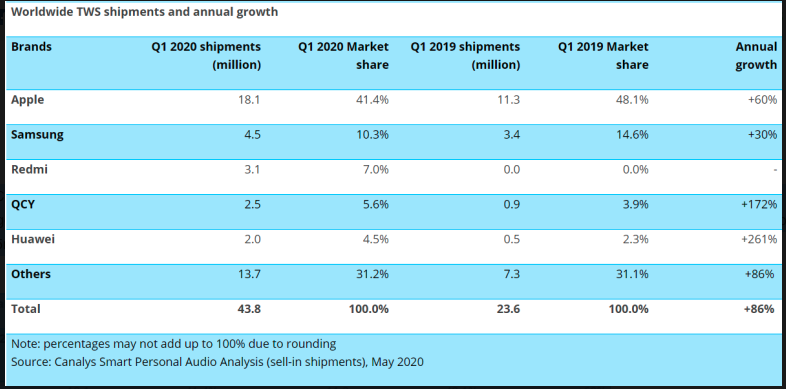 According to the latest Canalys estimates, worldwide shipments of smart audio devices reached 96.2 million units in Q1 2020. Among them, TWS held a 38% market share, making it the largest smart audio device category. QCY follows smartphone vendors Apple, Samsung, Xiaomi leading the market of TWS earbuds with our shipments up 172% at 2.5mn units in Q1 2020. QCY held a 5.6% market share, which makes us the 4th biggest TWS earbuds provider.